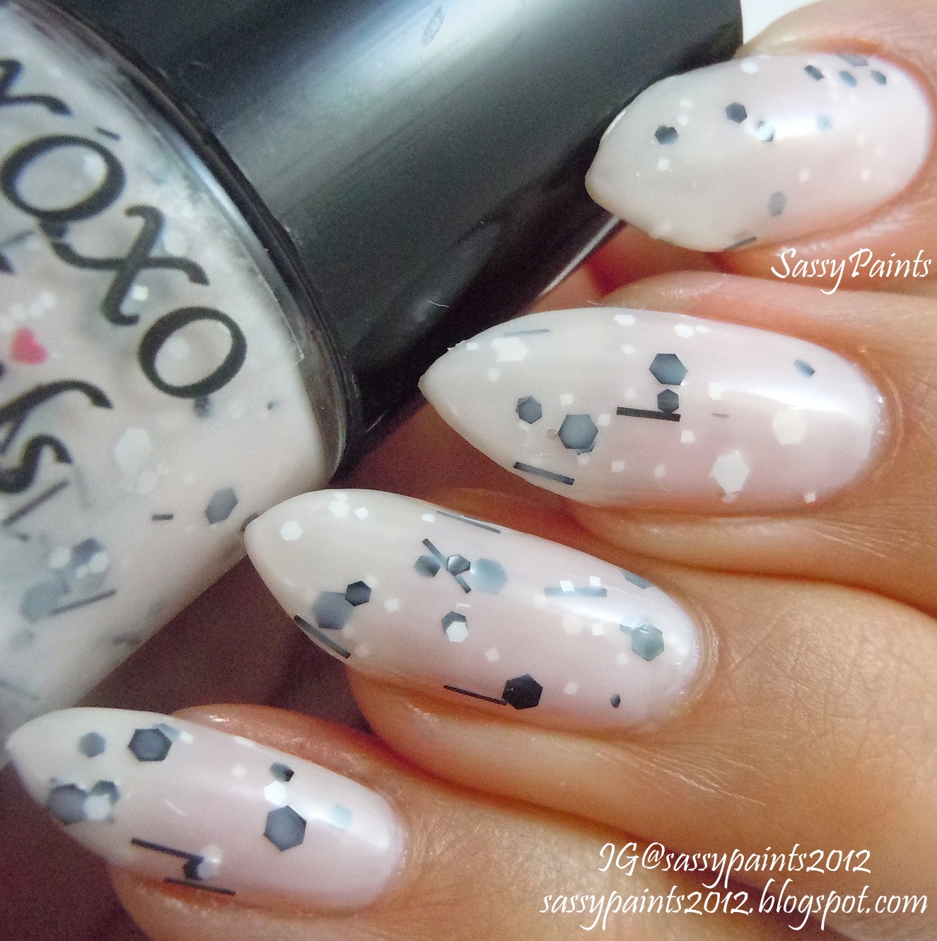 ...A nude creme base with hex, bar and square matte glitters in black and white.